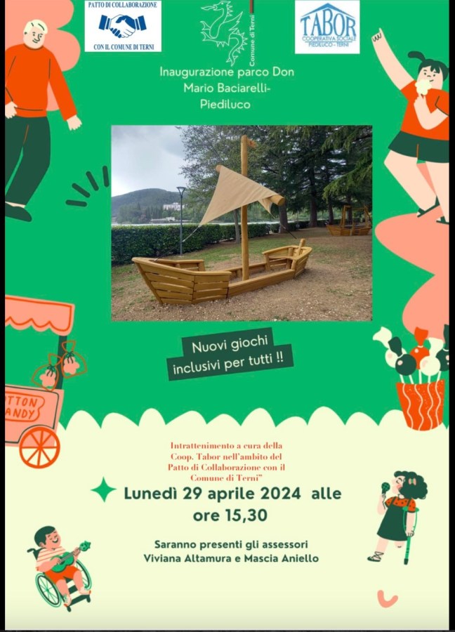 TERNI- Lunedì 29 Aprile alle ore 15,30 l’inaugurazione dei giochi inclusivi al parco Don Mario Baciarelli a Piediluco. Le assessore Viviana Altamura e Mascia Aniello annunciano su Fb che «l’idea è finalmente diventata una realtà». Sarà presente all’inaugurazione anche la cooperativa Tabor per rendere l’atmosfera più magica.