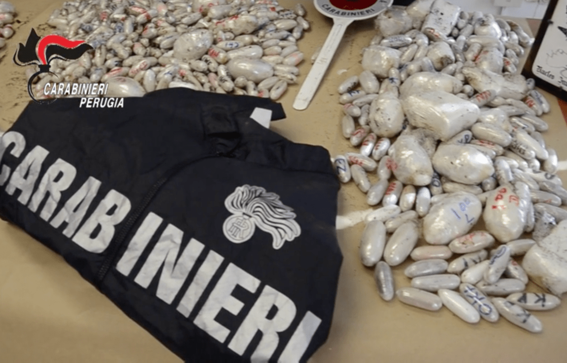 Nel prosieguo del filone investigativo gli investigatori, dopo l’arresto di tre cittadini nigeriani eseguiti tra febbraio e marzo 2023 a Terontola (AR) e Sinalunga (SI), trovati in possesso di oltre 1,5 chili di eroina, sono riusciti ricostruire una rete di connazionali, stanziali a Perugia e cittadini italiani, in grado d’importare sul capoluogo umbro notevoli quantità di stupefacente dall’estero. Le indagini sono state condotte mediante attività tecniche — nelle intercettazioni gli indagati usavano un linguaggio segreto e caratterizzato da regole ben definite e rigide e attraverso le tradizionali attività di indagine quali osservazioni e pedinamenti. Il gruppo, unitario e piramidale, era solito utilizzare come base logistica un’abitazione presa in affitto nel centro di Perugia presso la quale sarebbero stati “stoccati” e “rivenduti”, in pochi mesi, centinaia di chili di droga. Una volta ricevuto il carico di stupefacenti, presso l’immobile iniziava un vero e proprio “viavai” di altri connazionali i quali, a loro volta e con compiti ben definiti, acquistavano considerevoli quantità di sostanza che poi veniva venduta al dettaglio attraverso di decine di pusher; proprio l’impiego di questi ultimi, utilizzati anche come vettori, consentiva quotidianamente di alimentare le “piazze di spaccio” non solo dell’ Umbria ma anche quelle della Toscana, delle Marche e della Campania. I corrieri, al fine di eludere eventuali investigazioni, nel tempo avevano adottato le più disparate tecniche di occultamento; i diversi fermi operati consentivano di rinvenire stupefacente in fusti di detersivo, all’interno di confezioni sigillate di succhi di frutta, all’interno di pneumatici, tra la spesa di generi alimentari e poche volte occultati sulla persona. In più circostanze è stato accertato anche il ricorso alla pericolosissima tecnica dell’impiego dei “corrieri ovulatori”: in un caso, addirittura, è stato monitorato un soggetto (poi arrestato) che aveva ingoiato 42 involucri di eroina, trasportando così quasi mezzo chilogrammo di sostanza.