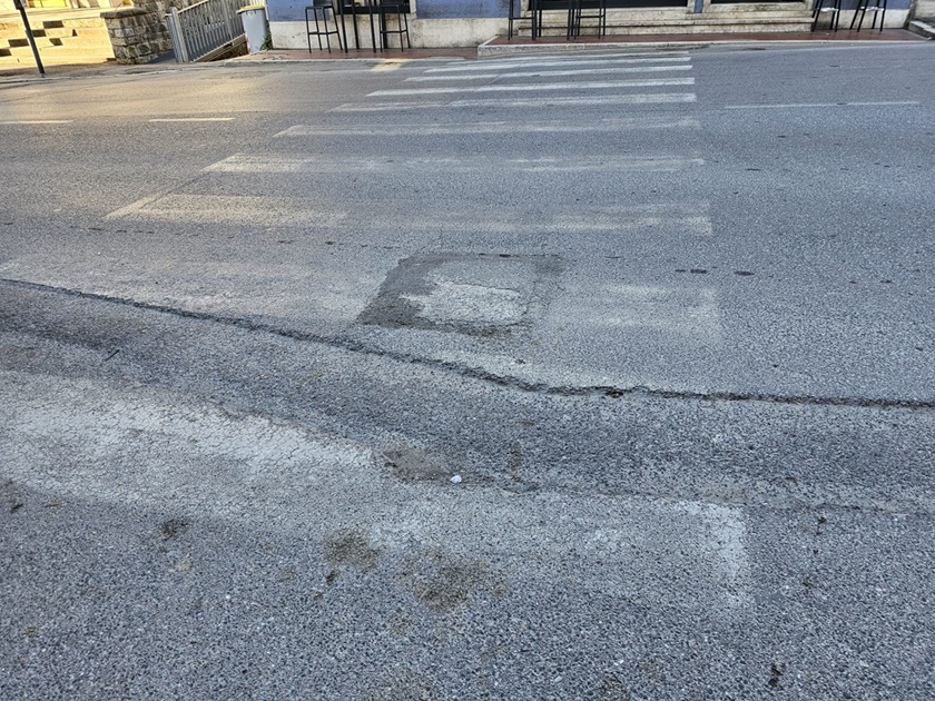 Una strada a doppio senso e molto transitata, ormai ridotta, a tratti, a una grande corsia unica, vista l’assenza a terra delle strisce divisorie. E se si arriva alla rotatoria attenzione a non entrare troppo all’interno con il muso della vettura o a rimanere indietro che la segnaletica, guardando la strada, è carente. Unica consolazione, almeno gli attraversamenti pedonali sono ancora visibili, seppur una bella verniciata probabilmente non farebbe male.