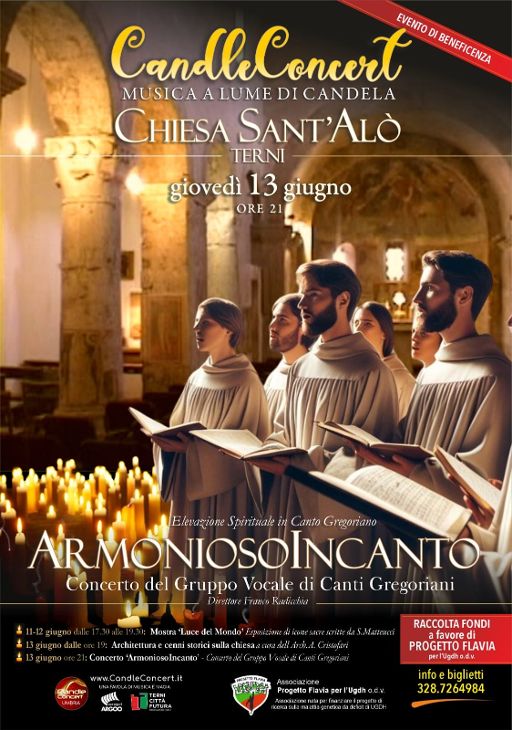 TERNI- «Questa volta le candele del candleconcert torneranno ad accendersi per illuminare non solo una delle più antiche chiese di Terni ma anche la speranza della ricerca. È bene mettere a disposizione ciò che si ha e ciò di cui si è capaci di fare per chi è meno fortunato, lotta e spera per il suo futuro. Siamo felici di poter annunciare un evento di beneficenza a supporto dell’associazione progetto Flavia e dei suoi scopi». Dopo il successo del Candle concert – recital lirico a Narni questa volta le candele sono pronte a creare una nuova atmosfera assai suggestiva tra le più antiche chiese di Terni, Sant’ Alo’, sconosciuta a molti perché tornata visitabile solo da poco, illuminata da centinaia di candele ad avvolgere un coro di voci che intonano antichi canti gregoriani. Tutto questo si lega alla finalità benefica per cui Candle Concert e Associazione Progetto Flavia per l’ugdh o.d.v.hanno organizzato questa iniziativa. Il concerto si terrà giovedi’13 giugno alle ore 21.00. Per partecipare occorre prenotarsi al cell. 3287264984 oppure compilando l’apposito form dalla pagina www.candleconcert.it o recandosi presso il negozio NewSinfony in galleria del corso. L’intero biglietto di ingresso servirà ad aiutare la ricerca sulla malattia genetica da deficit di UGDH della piccola Flavia. Il concerto sarà anticipato da altri importanti momenti. Nei giorni precedenti verrà allestita sempre all’interno della Chiesa una mostra di icone sacre a cura di Stefano Matteucci, visitabile martedì 11 Giugno e mercoledì 12 Giugno dalle ore 17.30 alle 19.30. Nella giornata del concerto dalle ore 19 si potrà inoltre partecipare ad una introduzione alla architettura e storia della chiesa a cura dell’arch. Andrea Cristofari.