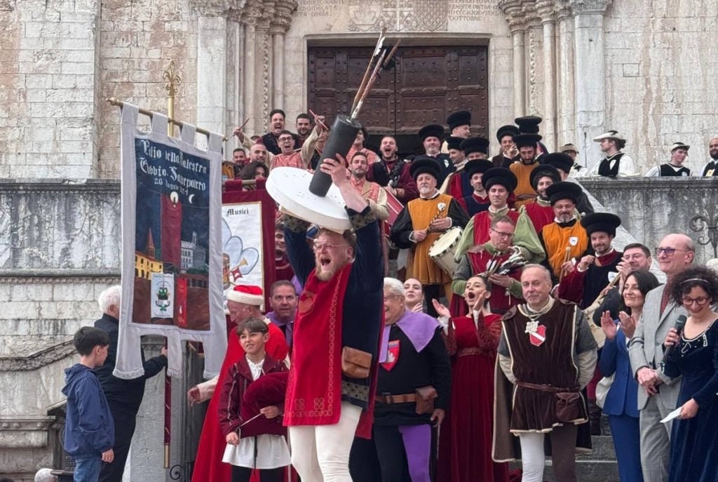 GUBBIO (Perugia) – Trionfo tutto eugubino nell’edizione di maggio del Palio della Balestra. In piazza Grande, a conquistare il primo posto nella sfida contro i balestrieri di Sansepolcro è stato il giovane tiratore Emanuele Bartolini. A lui il compito di alzare al cielo il palio realizzato dall’artista Enzo Di Franco. Secondo e terzo posto sempre appannaggio della Società balestrieri Città di Gubbio, con il capobanco Francesco Morelli e il maestro d’armi Rodolfo Radicchi. Sui banchi di tiro si sono succeduti 47 tiratori scelti per entrambe le società. L’appuntamento è per la seconda domenica di settembre, quando il Palio si svolgerà in terra biturgense.
