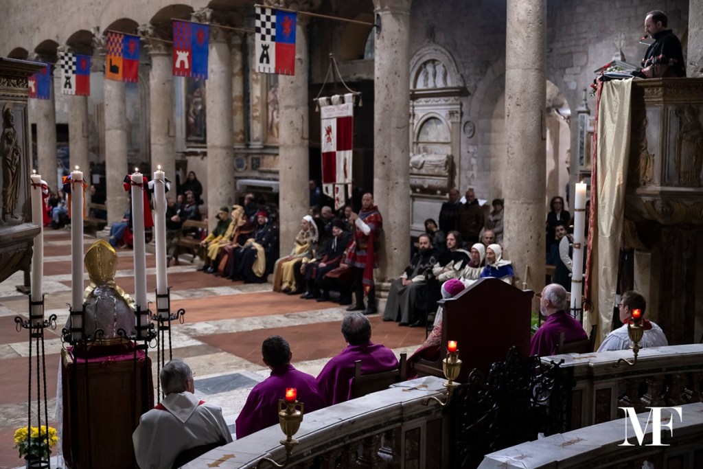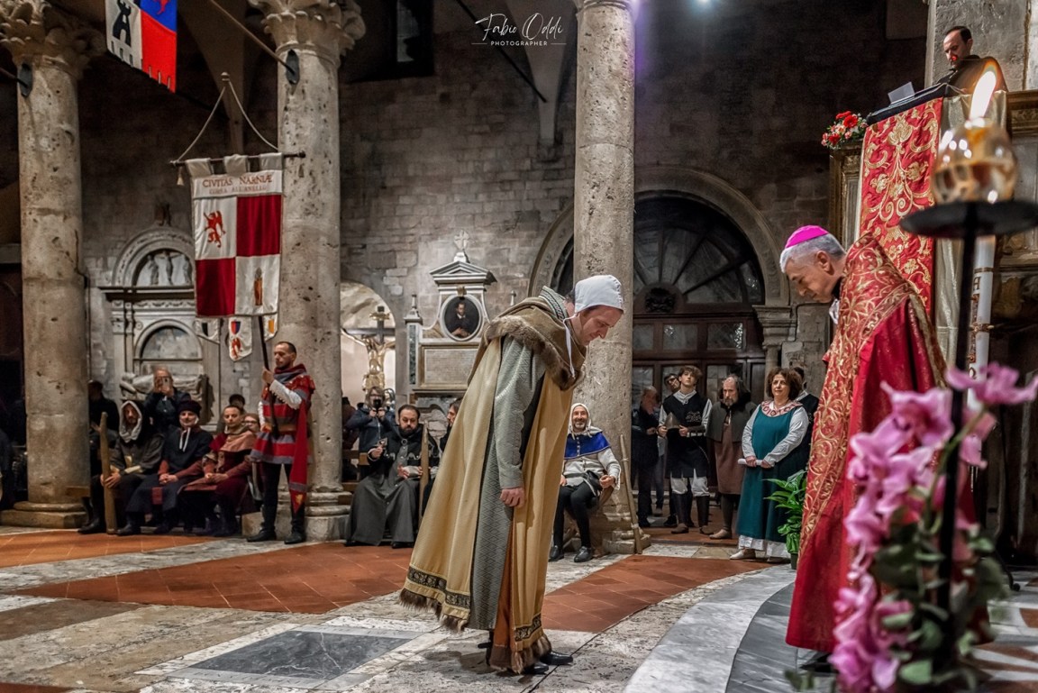 Primo ad andare in scena “De cereis et palii offerendi” (2 maggio alle 21.30). La suggestiva luminaria partirà da palazzo Comunale e vedrà sfilare al chiarore delle fiaccole autorità comunali e pontificie, corporazioni, nobili e magistrature cittadine dei castelli, fino al Duomo di Narni. Il corteo recherà un grande cero che sarà consegnato al vescovo in segno di rispetto e devozione al Santo.