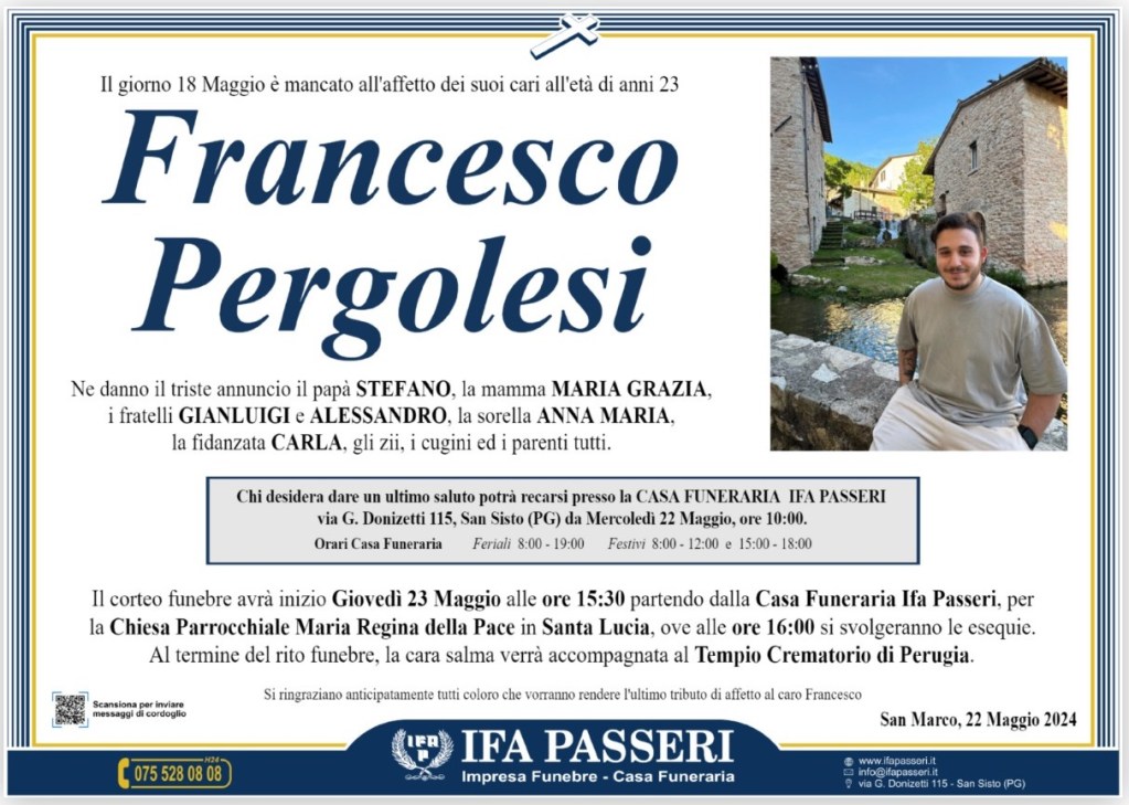PERUGIA – Sono stati fissati i funerali di Francesco Pergolesi, il ragazzo di soli 23 anni morto nell’incidente in via San Galigano sabato 18 maggio.