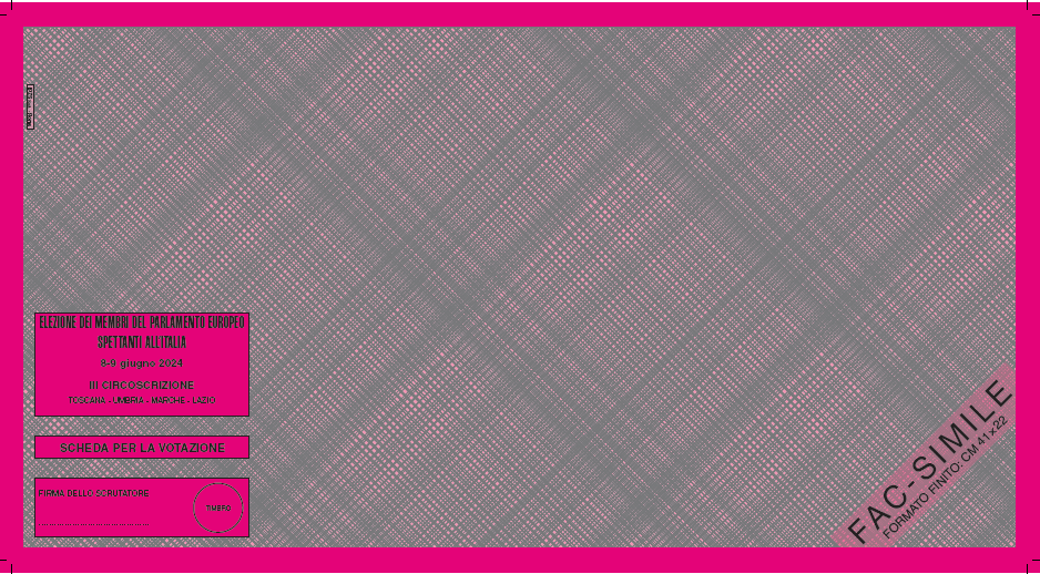 PERUGIA – Svelata la scheda per le elezioni Europee. Il ministero dell’Interno, ha infatti pubblicato il fac simile della scheda di colore rosso rubino che gli elettori della circoscrizione Italia Centrale (comprendente oltre l’Umbria il Lazio, le Marche e la Toscana) infileranno nell’urna l’8 e il 9 giugno. Sono 12 i simboli presenti, 4 suddivisi in 3 colonne: apre la lista Libertà, seguono Fratelli d’Italia, Forza Italia, Alleanza Verdi Sinistra, Lega, Movimento 5 Stelle, Alternativa Popolare, Stati Uniti d’Europa, Democrazia Sovrana e Popolare, Pace Terra Dignità, Partito Democratico e Azione.