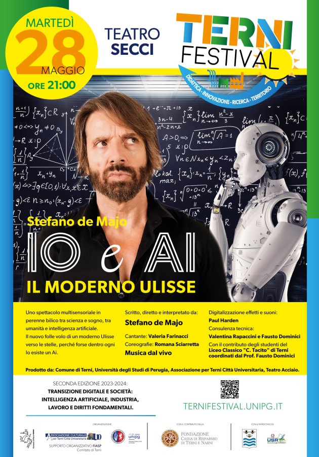 Per quanto riguarda lo spettacolo di De Majo, si tratta di un testoche parte da un gruppo di studenti del Liceo Ginnasio Statale “Gaio Cornelio Tacito” ai quali è stato chiesto di imbastire un canovaccio teatrale sul tema della Intelligenza Artificiale. Coordinati dal docente Fausto Dominici, hanno realizzato la prima stesura, che è stato la base utilizzata dall’attore professionista Stefano De Majo per scrivere il testo che sarà portato in scena. Per quello che vuole essere uno spettacolo multisensoriale in perenne bilico tra scienza e sogno, tra umanità e intelligenza artificiale. Il nuovo folle volo di un moderno Ulisse verso le stelle, perché forse dentro ogni lo esiste un Ai. Lo spettacolo, prodotto dal Comune di Terni, dall’Università degli Studi di Perugia, dall’Associazione per Terni Città Universitaria, dal Teatro Acciaio, vede la partecipazione della cantante Valeria Farinacci, con le coreografie di Romana Sciarretta, digitalizzazione effetti e suoni di Paul Harden, la consulenza tecnica di Valentina Rapaccini e Fausto Dominici.