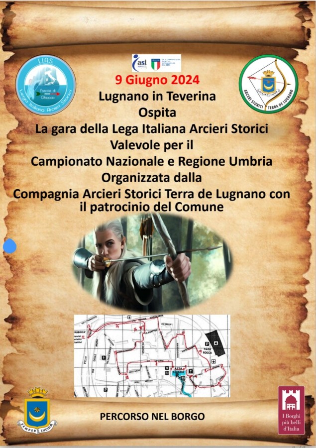 TERNI – Gli arcieri della compagnia “Arcieri Storici Terra de Lugnano ” organizzano la XVI° gara del campionato nazionale Lias-Asi 2023/2024. La competizione si terrà nel borgo medioevale di Lugnano in Teverina il 9 giugno. Si svolgerà su 18 piazzole, toccando tutti gli angoli più suggestivi del borgo.