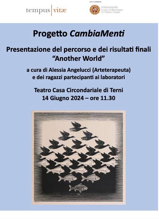 “Another world” è una delle azioni del progetto CambiaMenti promosso e gestito dall’associazione Tempus Vitae con il contributo della Fondazione Carit. Il Progetto ha visto la realizzazione di attività rivolte ad adolescenti e giovani adulti, nonché alle loro famiglie, al fine di prevenire situazioni di disagio giovanile, sensibilizzarli a tematiche di attualità sociale dilaganti nel nostro contesto territoriale, orientarli nel mondo della formazione e del lavoro.