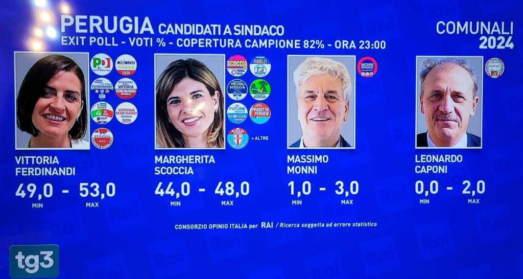 PERUGIA – Le urne per le elezioni comunali si sono chiuse alle 23 di domenica 9 giugno e i primi exit poll di Consorzio Opinio Italia per la Rai danno avanti la candidata del centrosinistra Vittoria Ferdinandi.