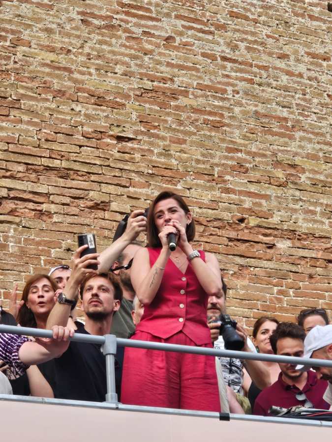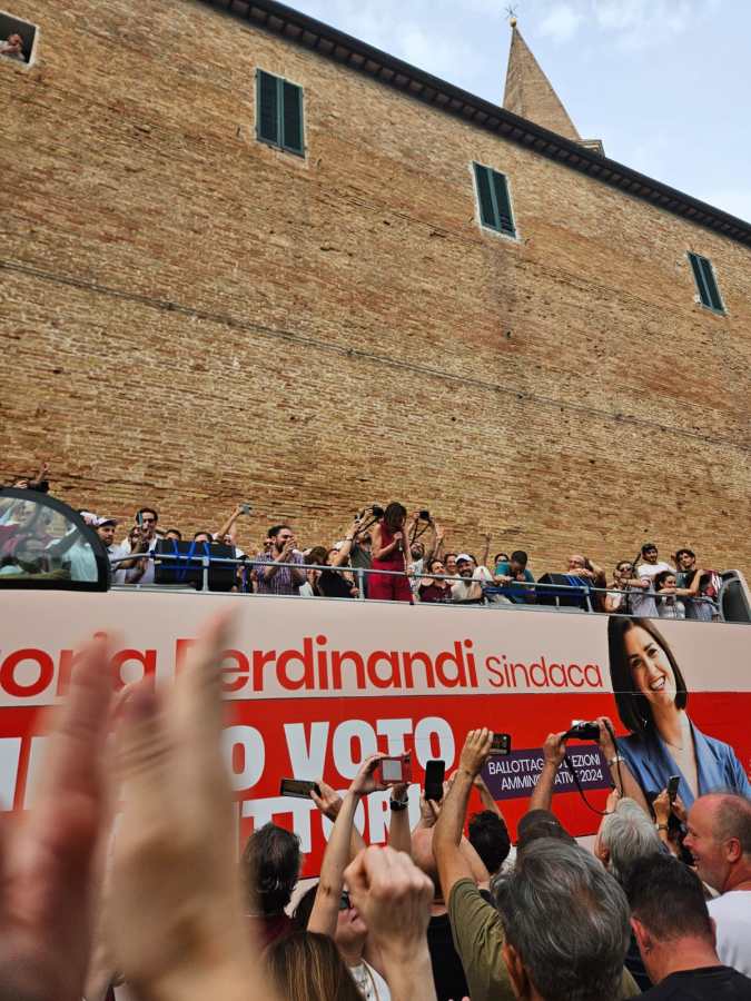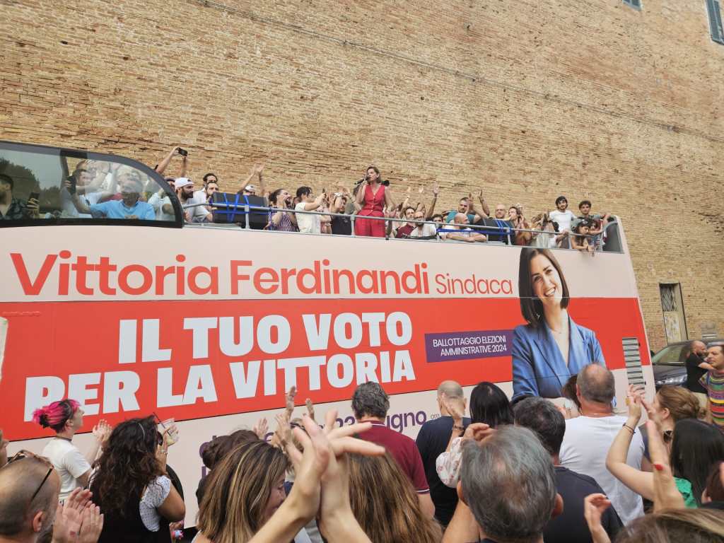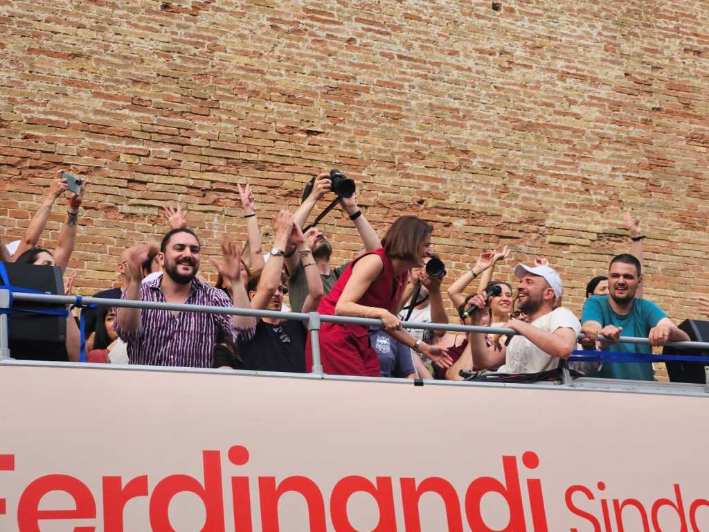 PERUGIA – Vestita di rosso, la candidata sindaca Vittoria Ferdinandi arriva al Frontone, davanti al monumento simbolo del XX Giugno di Perugia, a bordo dell’autobus che per due giorni ha girato la città, tra canti, feste e tappe in mezzo ai cittadini.