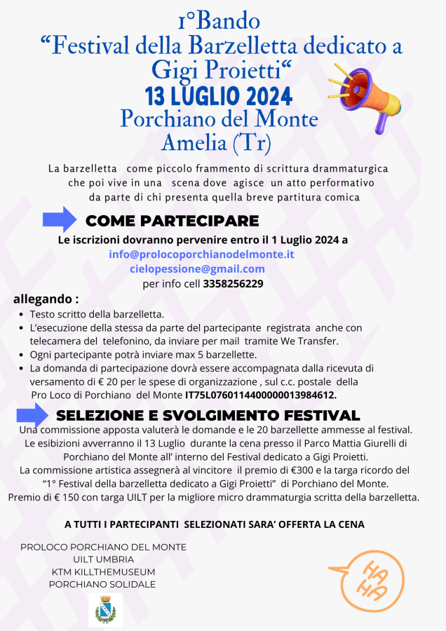 TERNI – Il 13 luglio al parco Mattia Giurelli di Porchiano del Monte si sfideranno 20 barzellette scelte da una commissione artistica. In occasione della cena organizzata per il Festival della Barzelletta dedicato a Gigi Proietti. L’evento è organizzato dalla Proloco di Porchiano del Monte di Amelia, Uilt Umbria, KTM Kill the museum e l’associazione Porchiano Solidale, in collaborazione con il Comune di Amelia, dedicandolo a Gigi Proietti perché Porchiano era terra nativa dei suoi genitori, che l’attore frequentava quando era bambino.