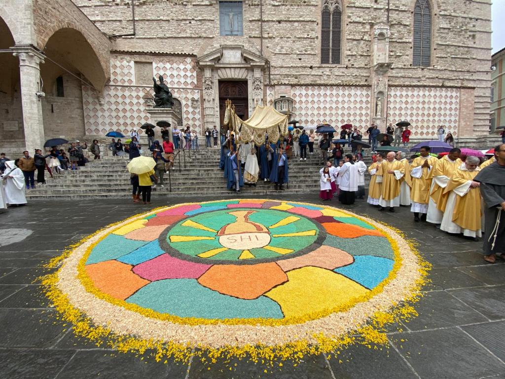 PERUGIA – «Quanto bisogno abbiamo oggi di questa festa. Ci dice che Dio si fa così vicino da farsi nostro cibo, si fa forza che sostiene nel cammino spesso sofferto del vivere quotidiano»: sono queste le parole pronunciate dell’arcivescovo di Perugia-Città della Pieve, Ivan Maffeis, in occasione del Corpus Domini. Dopo la messa in san Lorenzo, è stata rinnovata la tradizione della solenne processione, risalente al secolo XIV, una delle più antiche, partecipate e sentite della città, dalla cattedrale alla basilica di san Domenico «Questa festa – ha proseguito Maffeis – ci dice che l’amore esiste ed è pane spezzato, perché la vita fiorisce solo quando la si dona, quando la si condivide».