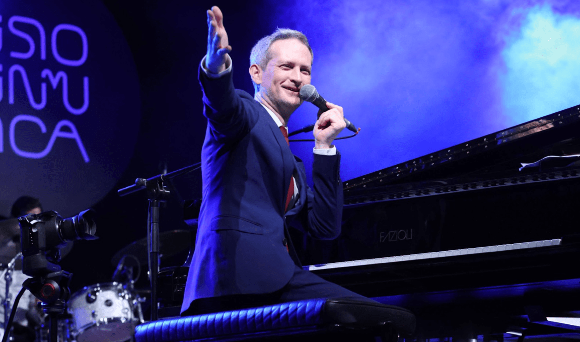 Il pianista e cantante inglese ha dato vita ad un concerto dal ritmo swing reinterpretando brani di grandi icone della musica mondiale. “Da Cole Porter a Frank Sinatra” ad iniziare dalle atmosfere di Broadway e Hollywood, con brani nati per musical o film, che successivamente hanno superato i confini del teatro o dello schermo cinematografico, divenendo jazz standard a pieno titolo, con vita autonoma. Basti pensare a Too Darn Hot di Cole Porter, scritta per il musical Kiss me, Kate (1948), poi ripresa da Ella Fitzgerald (1956) e Mel Tormé (1960). In molti casi, agli interpreti originali dei musical – Fred Astaire su tutti – hanno fatto seguito i più grandi jazzisti: di questi Strong raccoglie l’eredità, senza imitare o riprodurre, ma reinterpretando ogni brano con la sua brillante raffinatezza. Così appaiono gli storici pezzi di Irving Berlin (Cheek to cheek), Jerome Kern (The way you look tonight) e George Gershwin (They can’t take that away from me), che con la sua voce risuonano di rinnovata freschezza. E questo avviene anche per Sixteen Tons, canzone non tratta da musical, che però dalla sua prima incisione del 1946 vanta innumerevoli cover: questa versione rappresenta una vera e propria “chicca” nello spettacolo, con una melodia e un ritmo ancora più coinvolgenti.