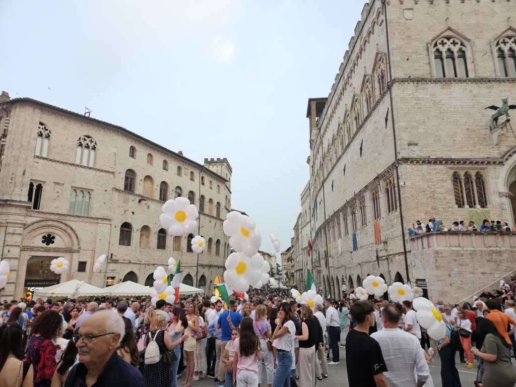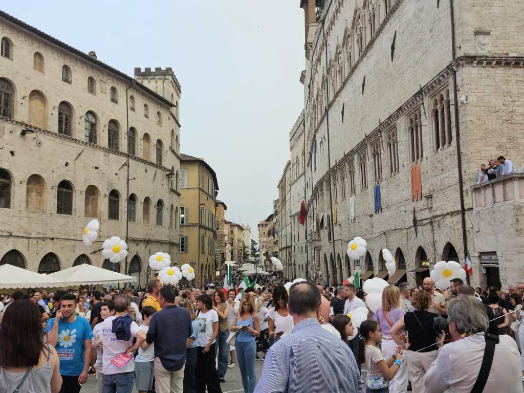 PERUGIA – Chiusura di campagna elettorale di Margherita Scoccia in piazza IV Novembre, tra migliaia di suoi sostenitori e il popolo del centrodestra, in mezzo a palloncini e luci sui palazzi a forma di margherita.