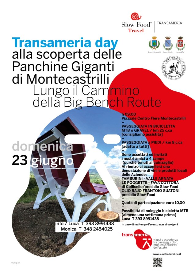 Tra gli entusiasti organizzatori, Luca Asciutti, socio e attivista Slow Food : «Transameria è un percorso enogastronomico a forma di 8, perché parte da Amelia e arriva a Todi e viceversa. È un progetto in collaborazione con le condotte Slow Food di Terni, Amelia e Todi ed è diverso da un cammino semplice, in quanto la sua missione è quella di mettere il territorio a disposizione di camminatori, dei ciclisti e di quanti prendono parte all’iniziativa per scoprire insieme le tipicità che fanno parte del circuito Slow Food. Questo appuntamento che si svolgerà a Montecastrilli è un’occasione per far conoscere un tratto di territorio che riteniamo tra i più suggestivi. Domenica andremo a vedere le panchine con due gruppi e due percorsi diversi: 4 panchine saranno raggiunte in bici mentre le altre 2 a piedi. Un esperto di storia del territorio spiegherà i percorsi e accompagnerà le scoperte dei partecipanti. Sarà presente anche il direttore della foresta fossile di Dunarobba che spiegherà i ritrovamenti fatti nella zona, ad esempio i reperti risalenti a due milioni e mezzo fa. Al rientro un aperitivo con le eccellenze del territorio e un bel brindisi finale».