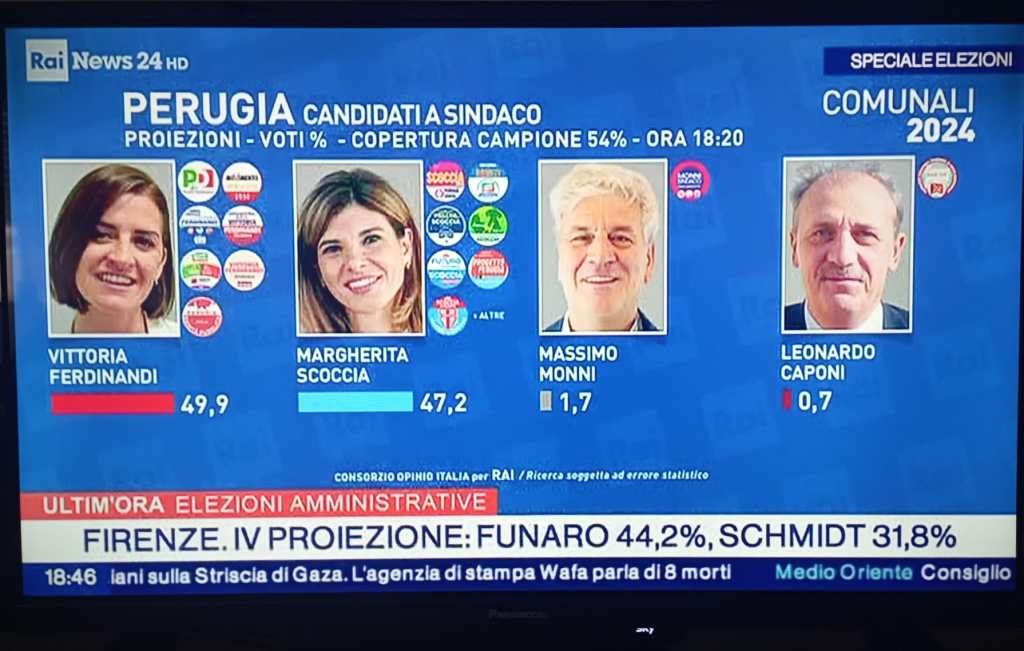 Alle 15.45, mentre lo spoglio procede a rilento, la Rai ha reso nota la prima proiezione sul voto perugino. Con il 9% del campione viene confermato il testa a testa tra Ferdinandi (centrosinistra) al 49,8 e Margherita Scoccia (centrodestra) al 47,3. All’1,6 Massimo Monni (Perugia Merita) e allo 0,7 Leonardo Caponi (Pci). Non rilevato Baiocco