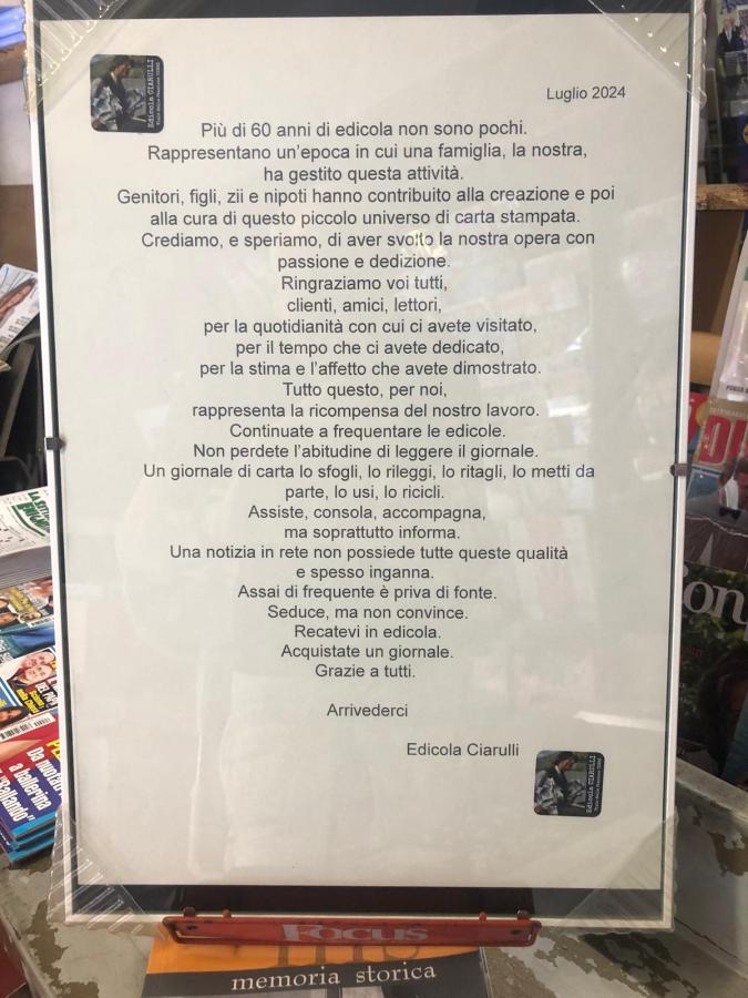 TERNI- Franco e Massimo Ciarulli annunciano la chiusura dell’edicola in viale della Stazione. « Più di 60 anni di edicola non sono pochi. Rappresentano un’epoca in cui una famiglia, la nostra ha gestito questa attività. Genitori, figli, zii e nipoti hanno contribuito alla creazione e poi alla cura di questo piccolo universo di carta stampata. Crediamo, e speriamo, di aver svolto la nostra opera con passione e dedizione. Ringraziamo voi tutti, clienti, amici, lettori, per la quotidianità con cui ci avete visitato, per il tempo che ci avete dedicato, per la stima e l’affetto che avete dimostrato. Tutto questo, per noi, rappresenta la ricompensa del nostro lavoro. Continuate e frequentate le edicole. Non perdete l’abitudine di leggere il giornale. Un giornale di carta lo sfogli, lo rileggi, lo ritagli, lo metti da parte, lo usi, lo ricicli. Assiste, consola, accompagna., ma soprattutto informa. Una notizia in rete non possiede tutte queste qualità e spesso inganna. Assai di frequente è “priva di fonte“. Seduce, ma non convince. Recatevi in edicola. Acquistate un giornale. Grazie a tutti».