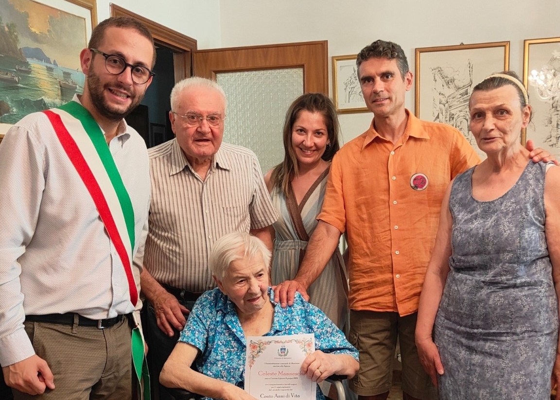 MARSCIANO (Perugia) – C’è una nuova centenaria in città: è la signora Celeste Manneschi. Nata l’8 giugno del 1924 a Cortona, in provincia di Arezzo, nonna Celeste nel 1957 insieme al marito Guido Peverini e al figlio Marco, si è trasferita a Marsciano, dove si è presa cura della famiglia che è poi cresciuta con la nascita di due nipoti. A portarle il saluto dell’amministrazione e della comunità di Marsciano è stato il sindaco Michele Moretti, che le ha lasciato un omaggio floreale e un attestato, e si è congratulato per un traguardo così importante raggiunto dopo una vita dedicata con grande dedizione alla propria famiglia e all’impego sociale.