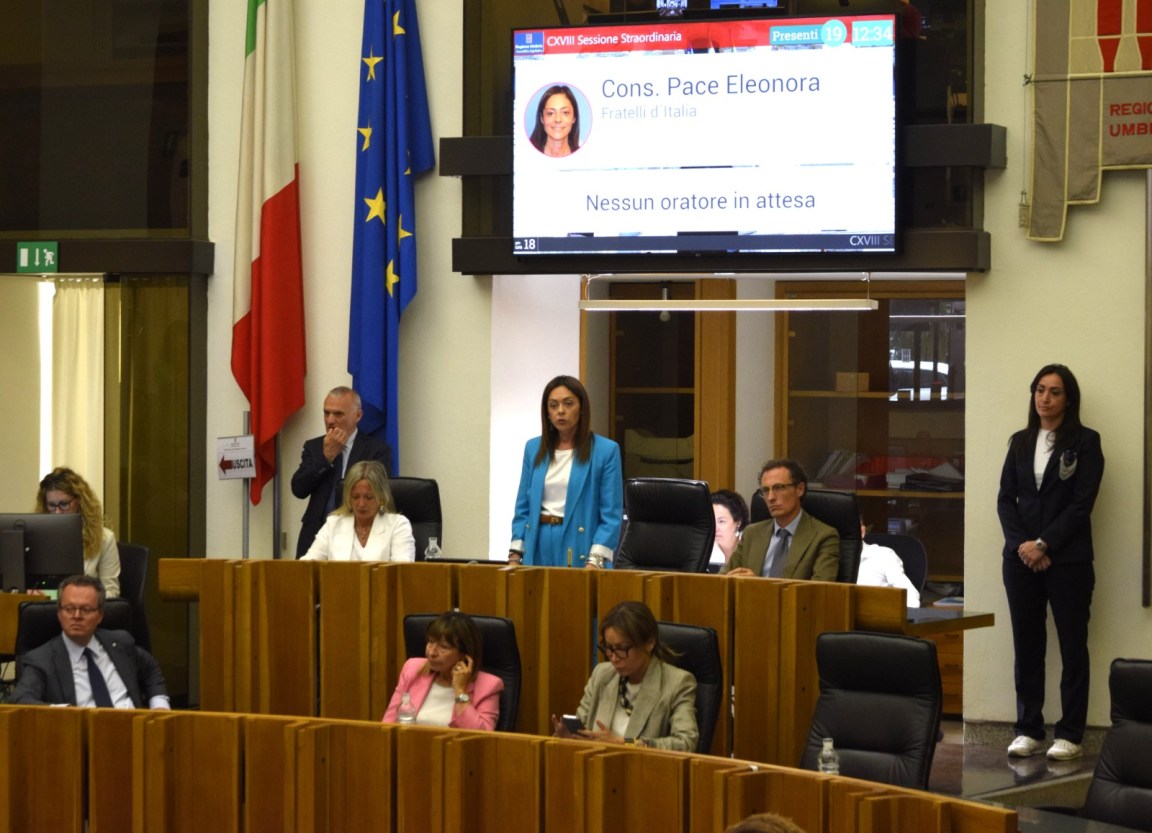 Dopo l’elezione, il presidente Pace ha preso la parola per sottolineare che «si tratta di un grande onore. La legislatura terminerà tra pochi mesi ma ho l’ambizione di non farli passare inutilmente. Le assemblee e i consigli vivono un momento di difficoltà con una forte riduzione delle proprie prerogative. Non basteranno questi pochi mesi per invertire questo trend negativo. Potremo però rilanciare il protagonismo di questa aula, anche per agevolare chi verrà dopo di noi, per perseguire un’azione indirizzata al progresso e alla giustizia sociale. In questi 40 anni sono venuti meno i tratti identitari di questa istituzione. Tutta l’Italia mediana si trova schiacciata tra le pretese di autonomia del nord e le tendenze all’assistenzialismo del Mezzogiorno. Scontiamo l’inverno demografico, la scarsità di risorse e l’indebolimento del capitale umano. C’è molto da fare e noi dobbiamo interpretare degnamente la voglia di rivalsa degli umbri. Siamo in una fase di transizione e dobbiamo capire verso dove». L’Assemblea legislativa , ha garantito la neo presidente, sarà «il luogo della partecipazione e del confronto affinché si possa poi giungere ad una sintesi grazie alla dialettica consiliare. Dalla sanità all’agricoltura, dall’assetto del territorio alle infrastrutture, dobbiamo fare in modo di rendere l’Umbria un soggetto identitario forte e consapevole, uscendo dalla logica dei campanili per giungere ad una visione di sistema. L’azione politica e legislativa deve essere improntata alla concretezza. Le radici cristiano caratterizzano la nostra storia, così come le figure di San Francesco e San Benedetto». Ha aggiunto Pace: «Dobbiamo collaborare con la Giunta per portare avanti le riforme ma anche essere punto di riferimento dei territori. Sono orgogliosa della mia storia politica, fatta di difficoltà e di soddisfazioni. Sono stati anni difficili, in condizioni ai limiti dell’emarginazione. Tutto ciò mi ha messo nelle condizioni di guardare alle sfide del quotidiano senza paura. Senza far venir meno la mia identità, cercherò di volare alto e di rappresentare l’essenza dell’Umbria e delle sue istituzioni».