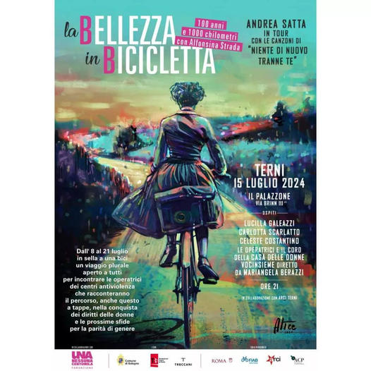 TERNI  – Nel centenario del Giro d’Italia, che vide la prima e unica donna nella storia a correre la gara insieme agli atleti uomini, “La bellezza in bicicletta. 100 anni e 1000 chilometri con Alfonsina Strada” è un nuovo progetto nato dalla passione e la visionarietà di Andrea Satta, artista, cantante dei Têtes De Bois, pediatra e pedalatore.Ogni giorno ci sarà una tappa per celebrare le conquiste delle donne. Il 15 luglio anche Terni sarà meta dello spettacolo, presso il cortile del Palazzone di Viale Brin (ingresso gratuito fino ad esaurimento posti). La tappa ternana, organizzata da Arci Terni, vedrà la presenza di: Carlotta Scarlatto (cantante), Lucilla Galeazzi (cantante), Celeste Costantino (Vicepresidente Fondazione Una Nessuna Centomila), le operatrici e il coro della Casa delle Donne Vocinsieme diretto da Mariangela Berazzi.