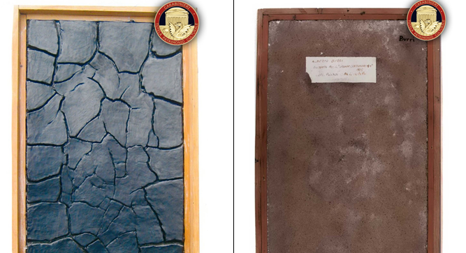 L’opera, che misura 49 x 28,7 cm, era stata presentata, nel novembre del 2022, da parte di un privato collezionista, alla Fondazione Palazzo Albizzini Collezione Burri con richiesta di rilascio della dichiarazione di autenticità, poiché ritenuta attribuibile al maestro Alberto Burri, avendo oltre alla firma visibile sul lato destro del retro anche una etichetta posta a tergo del manufatto riportante la seguente dicitura: “Bozzetto per il Grande Cretto nero G9 – 1975 / coll. Privata Città di Castello”, particolare che evidentemente aveva fatto intendere al detentore di avere fra le mani un pezzo originale. Fin da subito però la realizzazione materica, che per caratteristiche artistiche e di composizione è stata immediatamente associata alla imponente opera del maestro, il “Grande Cretto”, da lui creato tra il 1985 e il 1989 sulle macerie del paese di Gibellina, ricoprendo con uno strato di cemento di un metro e mezzo di altezza i ruderi di quello che era stato l’antico centro abitato del paese raso al suolo dal terremoto del Belice del 1968, ha suscitato nella commissione esaminatrice molte perplessità, soprattutto per gli aspetti tecnico-stilistici. Oltre alla visione diretta e alla consultazione del consistente archivio documentale dell’artista, detenuto e gestito dalla stessa fondazione, dove sono dettagliatamente registrate e schedate con particolare precisione quasi tutte le sue opere, vista l’assenza di qualsiasi informazione o riferimento al manufatto sottoposta ad expertise, lo stesso è stato classificato come non riconducibile alla produzione artistica di Burri, ovvero dichiarata inequivocabilmente falsa.