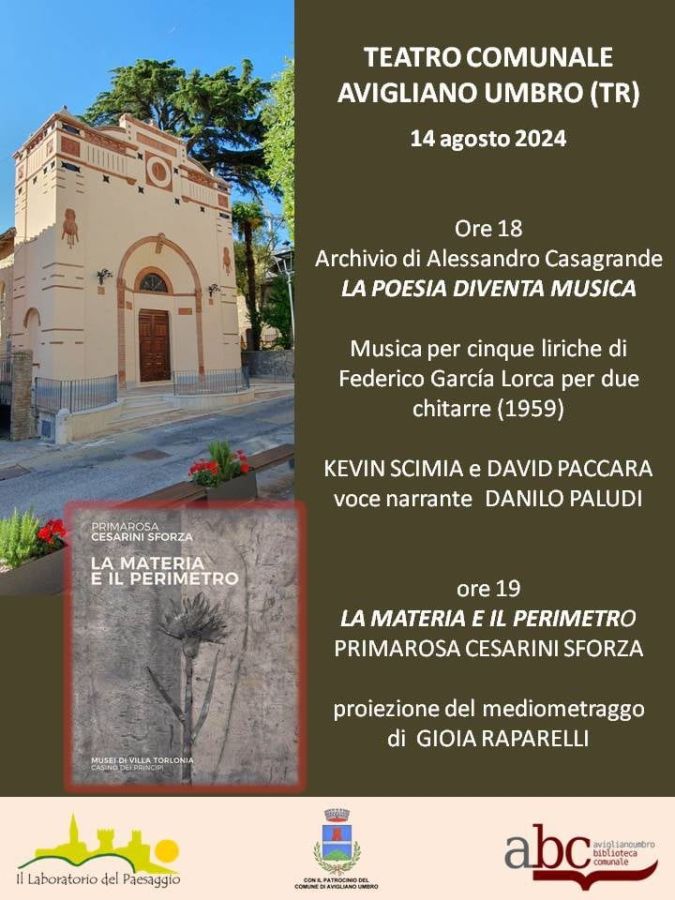 TERNI – In occasione di “Arte in Biblioteca” ci sarà in mostra un’artista d’eccezione: Primarosa Cesarini Sforza, la cui fama internazionale, onorerà la biblioteca comunale di Avigliano Umbro dall’11 al 15 agosto. L’evento è organizzato dal Laboratorio del Paesaggio. Nel pomeriggio sarà proiettato al teatro comunale alle ore 19  anche un mediometraggio “La materia e il perimetro” realizzato da Giulia Raparelli in occasione della mostra antologica su Primarosa Cesarini Sforza di Villa Torlonia dell’aprile scorso. Saranno presenti l’artista e la regista.