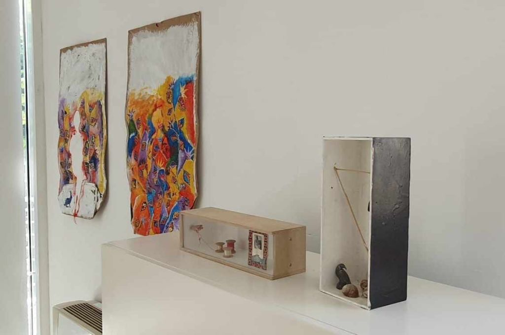 L’esposizione permette di cogliere alcuni aspetti dell’arte di Primarosa: l’artista accosta zone di colore e disegni, tagli e cuciture, pezze di stoffa, pastelli, carte, inchiostri, rete metallica, piccoli oggetti e ritagli, legni, spaghi e crea  un mondo fantastico in cui i personaggi si delineano e si dissestano, quasi a voler entrare di soppiatto negli occhi degli osservatori per scombinare il senso emotivo della percezione e suggerire una dimensione che conduce a risvolti enigmatici. Fortemente legato al fare manuale e alle suggestioni della materia,  l’assemblage è un dispositivo che incorpora e dà forma a temi desunti dal quotidiano e dal banale ma riproposti nei termini di memoria e fantasmagoria.”