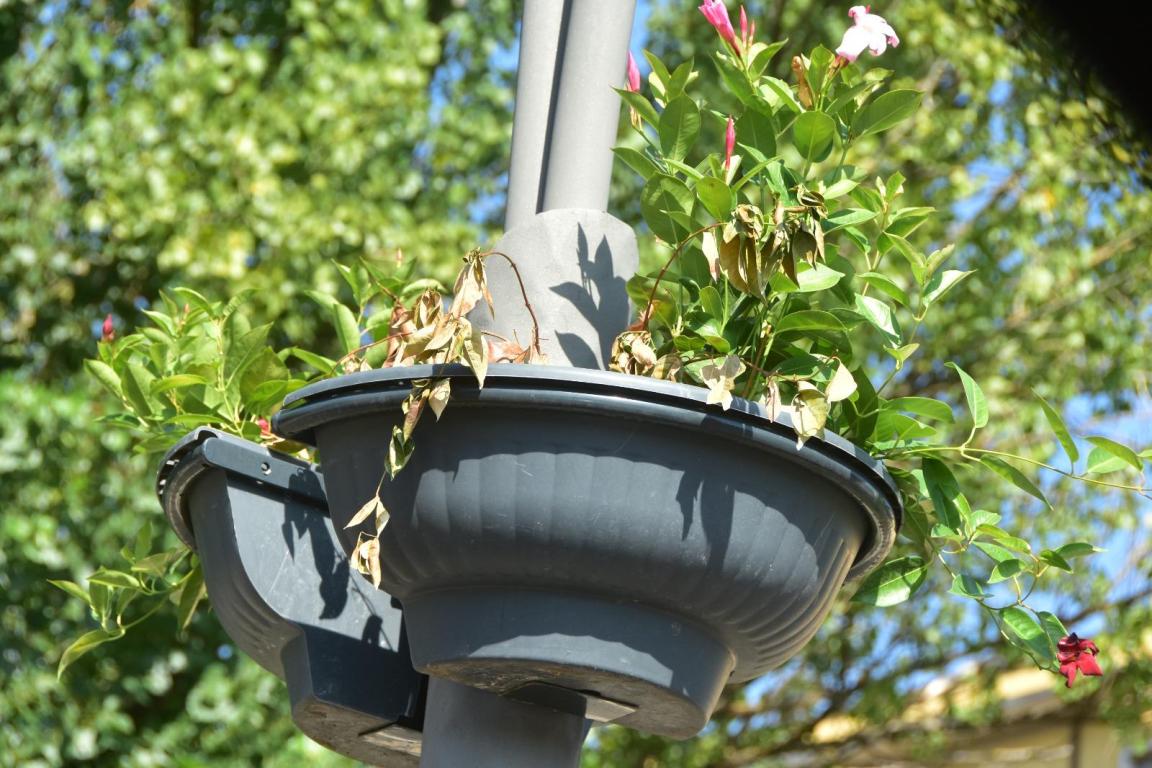 Gerani sostituiti con le dipladenie, una specie più resistente al sole. Ma ora anche queste sono in difficoltà. Non è difficile vederle completamente secche lungo ponte Romano. Hanno retto due settimane, in alcuni casi pochi giorni.