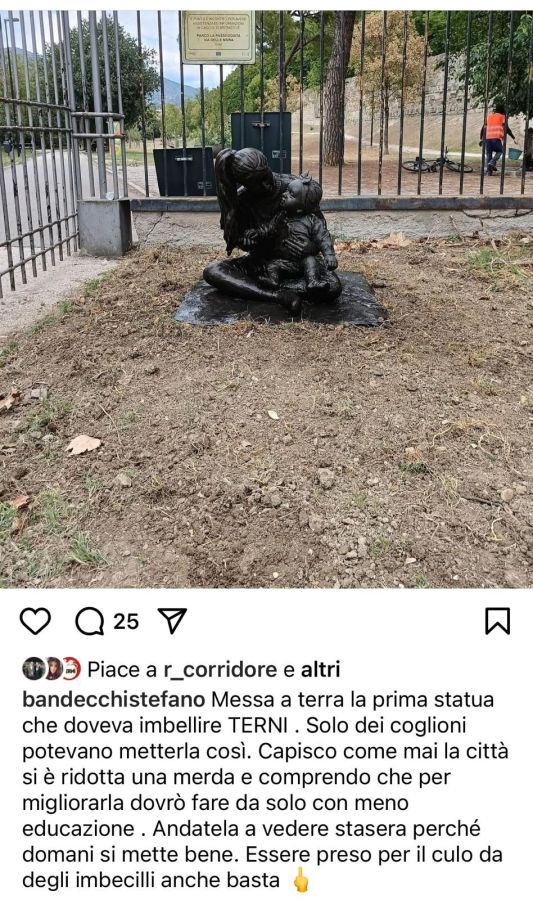 TERNI – «Solo dei coglioni potevano metterla così». L’amministratrice delle chat di Ap, Noemi Fogliano, finisce a terra fuori dal parco Ciaurro e a Bandecchi non gli va bene. Non la Fogliano in carne e ossa, ma la sua rappresentazione in bronzo, che invece doveva essere valorizzata. «Capisco come mai la città si è ridotta una merda – scrive il sindaco sul suo profilo Instagram – e comprendo che per migliorarla dovrò fare da solo con meno educazione ». E ancora: «Essere preso per il culo da degli imbecilli anche basta».