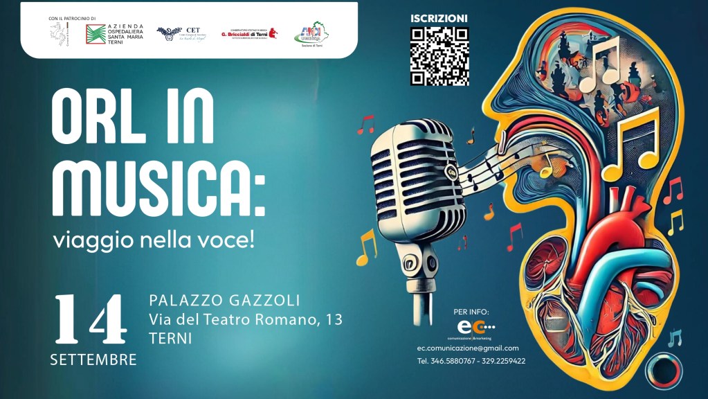 TERNI – Un evento che pone in primo piano non solo la prevenzione primaria e la necessità di conoscere la propria voce. Ma anche l’attività benefica. Si tratta dell’evento, promosso dalla Struttura Complessa di Otorinolaringoiatria dell’azienda ospedaliera Santa Maria di Terni, denominato “Orl in musica” che si svolgerà il 14 settembre dalle ore 17.45 alle ore 20.40 a Palazzo Gazzoli. Infatti il ricavato raccolto durante l’evento sarà donato alla Struttura Complessa di Otorinolaringoiatria (ORL), a vantaggio dei pazienti trattati.