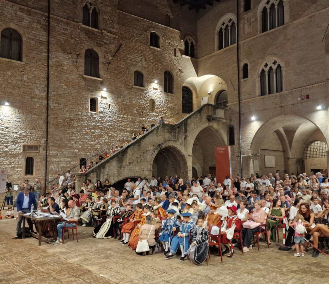 La manifestazione, che si protrarrà fino al prossimo primo settembre, si è aperta con la Serata d’arte e teatro nella corte di Palazzo Trinci: gli otto rioni, suddivisi a sorteggio in gruppi da due, si sono sfidati nella rappresentazione di fatti storici realmente accaduti, prendendo spunto dal periodo Rinascimentale italiano. All’interno della residenza nobile il numeroso pubblico ha assistito a una performance di notevole livello, frutto di un attento lavoro di ricerca portato avanti da tutti i rioni, che con grande maestria hanno saputo