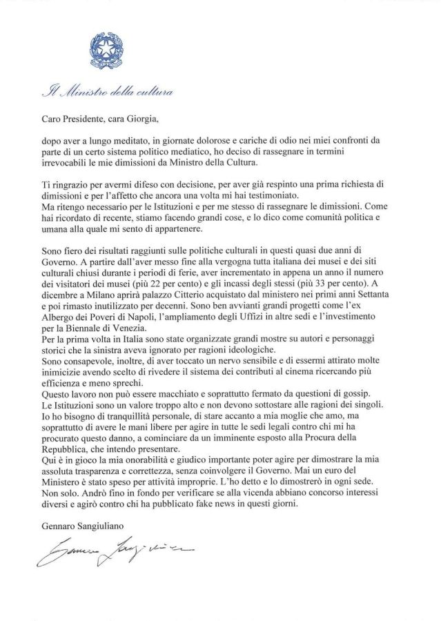 dopo aver a lungo meditato, in giornate dolorose e cariche di odio nei miei confronti da parte di un certo sistema politico mediatico, ho deciso di rassegnare in termini irrevocabili le mie dimissioni da Ministro della Cultura.