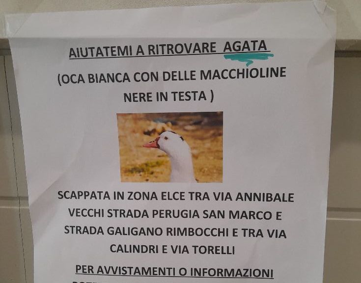 PERUGIA – A Perugia si cerca Agata, un’oca bianca con macchioline nere sul capo, scomparsa nella zona di Elce.