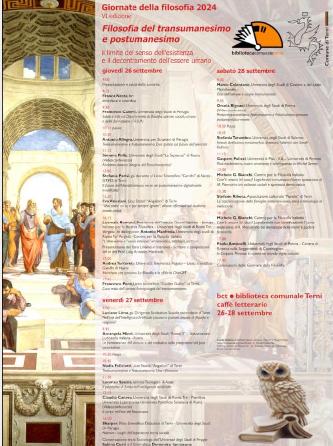 TERNI – Un appuntamento giunto alla sua sesta edizione che ritorna negli spazi della biblioteca comunale di Terni. Il tema per il 2024 delle Giornate della Filosofia è: “Filosofia del transumanesimo e postumanesimo. Il limite dell’esistenza e il decentramento dell’essere umano”. Dal 26 al 28 ottobre sarà possibile approfondire tematiche filosofiche e mettere alla prova certezze e idee preconcette.