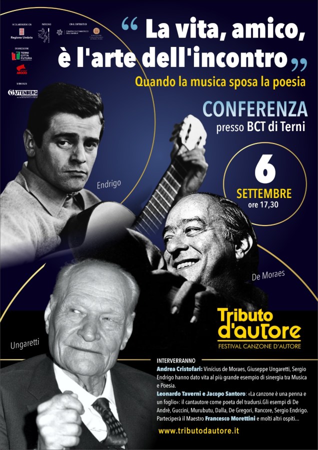 TERNI – “La vita, amico è l’arte ella’incontro” è il titolo della conferenza che si svolgerà il 6 settembre alle ore 17.30 alla Bct. L’iniziativa è organizzata in occasione del Tributo d’autore, festival canzone d’autore. Partendo dalla domanda: “La canzone d’autore italiana è poesia. Quale e perchè?”