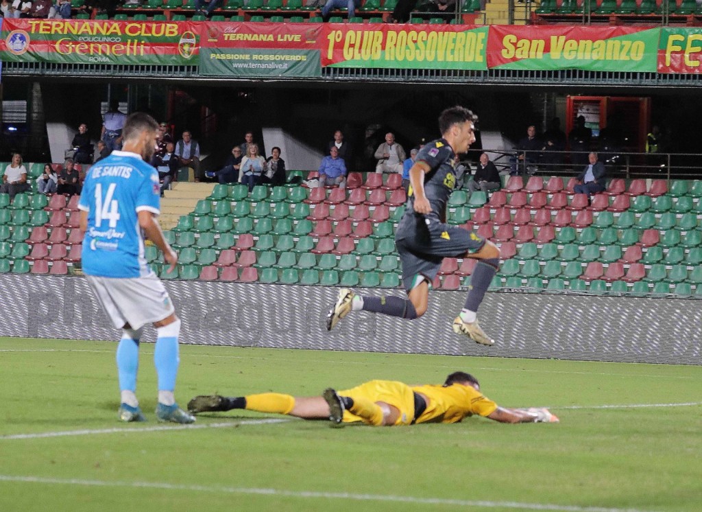 La Ternana però spinge e dopo 6 minuti trova un doppio intervento del portiere del Pineto Tonti che manda la palla in calcio d’angolo. Dopo pochi minuti, è il turno di Casasola il quale vede ancora la risposta dell’estremo difensore Tonti. È un assalto totale delle Fere contro un Pineto spento. Al ’20 circa è il turno di Cicerelli, particolarmente attivo in questa prima parte di gara. La Ternana non molla e al ’34 trova il gol con il numero 71 il bomber Pietro Cianci. I giocatori allenati da Abate in vantaggio 1-0 non smettono di attaccare mettendo sotto pressione la retroguardia abruzzese. Non passano nemmeno dieci minuti e al ’42 la Ternana raddoppia con Romeo. Un gol a due passi dalla porta dopo la parata di Tonti sulla conclusone di Cianci. Si chiude il primo tempo con le Fere in vantaggio 2-0.