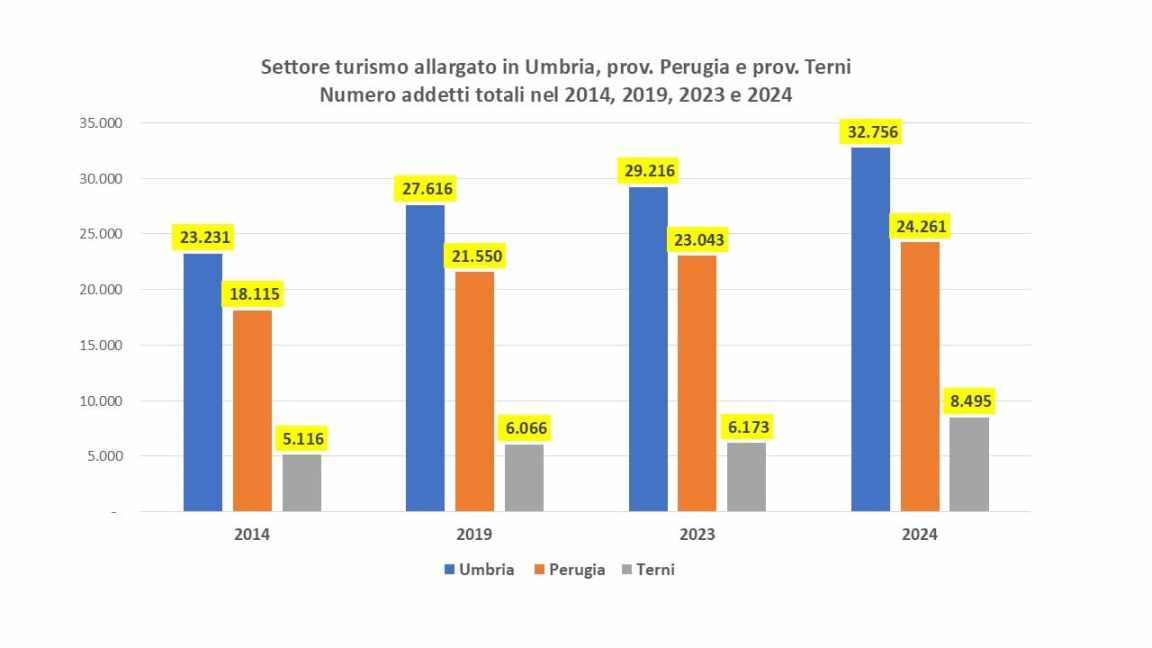 Risultati che pongono il settore del turismo allargato in Umbria non solo nella situazione di aver recuperato i livelli pre-pandemia (nel III trimestre 2019, ultimo anno prima del Covid, gli addetti erano 27mila 616), ma di essere andato abbondantemente sopra quei livelli (nel III trimestre 2024 gli addetti totali del settore turistico allargato sono 32mila 756). E il numero degli addetti del settore turistico allargato toccato nel III trimestre 2024 è il più elevato di sempre.