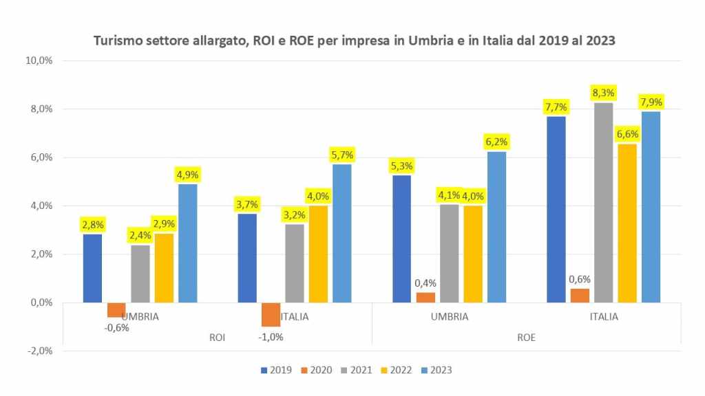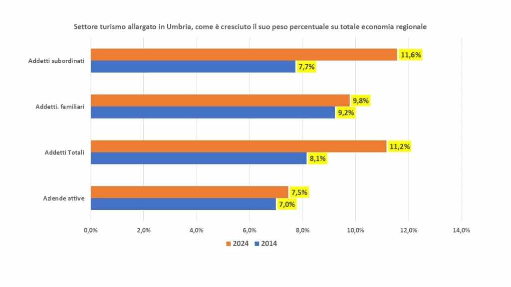 Un balzo in dieci anni – dal 2014 al 2024 – dall’8,1% all’11,2% (o dal 7,7% all’11,6%, se si prende solo il numero dei lavoratori dipendenti, escludendo quelli familiari) del peso del turismo nell’economia regionale dell’Umbria. Questo emerge dal report della Camera di Commercio dell’Umbria sull’andamento del settore turistico allargato (ossia considerando le attività di alloggio e ristorazione, più le attività dei servizi delle agenzie di viaggi, dei tour operator e servizi di prenotazione e attività connesse) nella regione nell’ultimo decennio e, per quanto riguarda i bilanci economico-patrimoniale delle imprese del settore, nell’ultimo quinquennio 2019-2023.