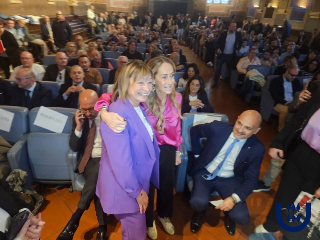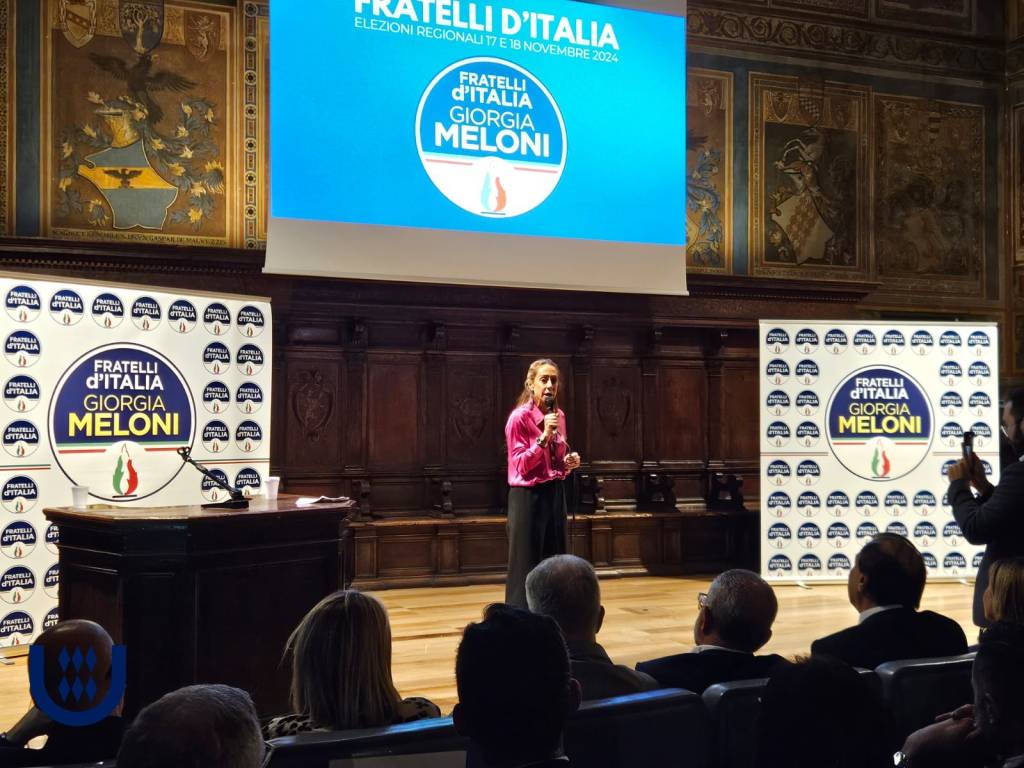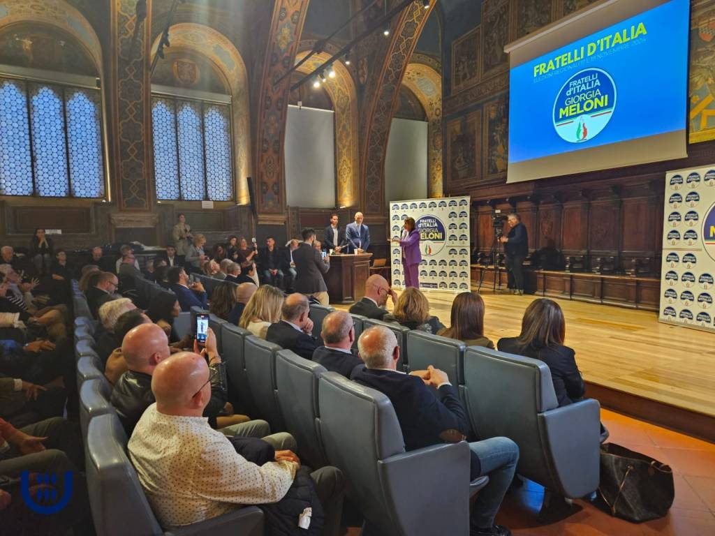 PERUGIA – Fratelli d’Italia c’è e vuole fare la parte del leone alle regionali del 17 e 18 novembre. Presentazione ufficiale per lista del partito di Giorgia Meloni a sostegno della governatrice uscente, Donatella Tesei in una sala dei Notari gremita. A benedire i 20 nomi che compongono la lista per è stata Arianna Meloni, capo della segretaria politica e responsabile tesseramento del partito di FdI. Presenti tra i big la presidente Tesei, il coordinatore regionale e sottosegretario all’Interno, Emanuele Prisco, l’europarlamentare Marco Squarta, il senatore Franco Zaffini, il viceministro all’Economia, Maurizio Leo e il sottosegretario al Mef, Lucia Albano.