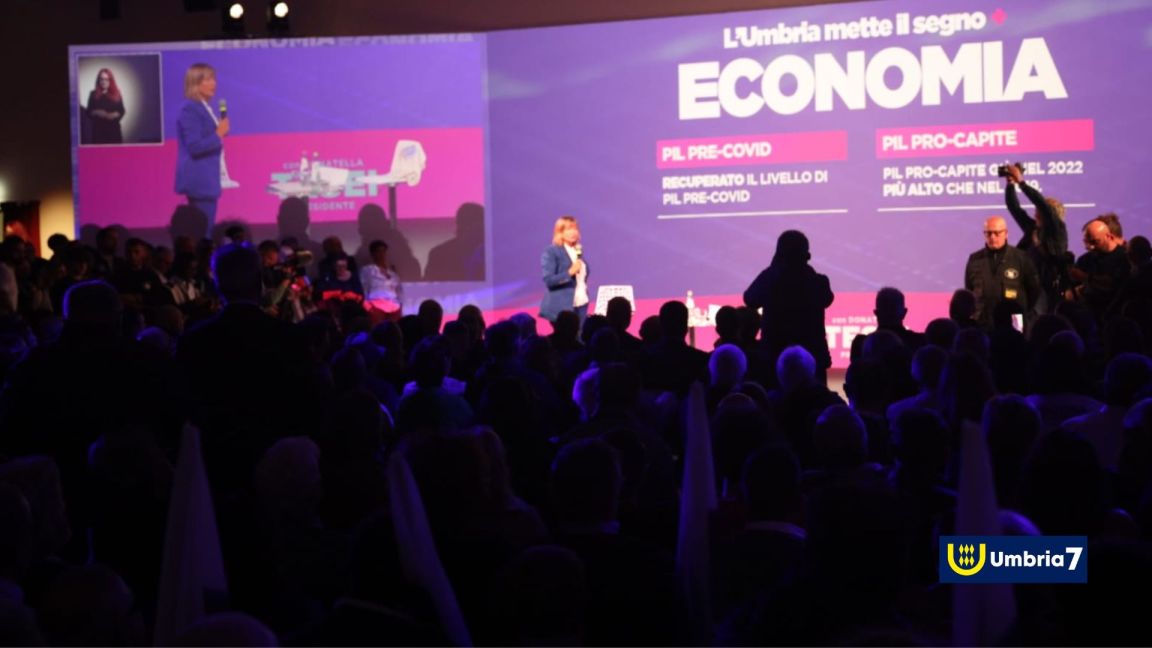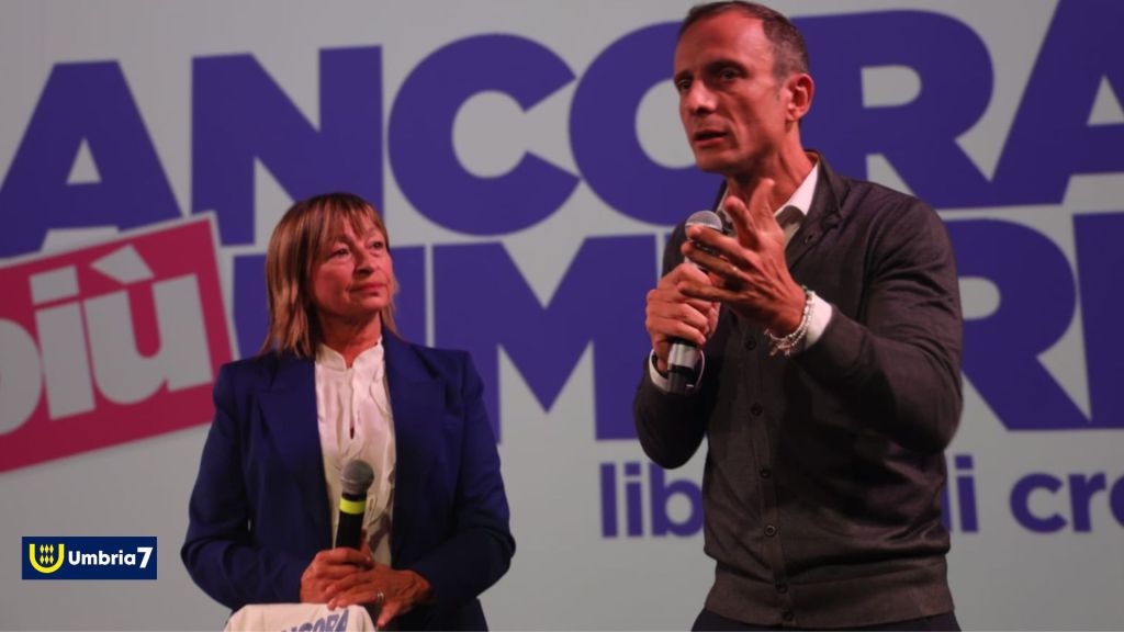 Chiedono: i sondaggi sono buoni per lei e per la coalizione di centrodestra, cambia qualcosa per la sua campagna elettorale? «Non guardiamo ai sondaggi. Noi raccontiamo quello che abbiamo fatto: infrastrutture, turismo, impegni concreti per i giovani e le famiglie. Su questo chiediamo il consenso degli umbri».