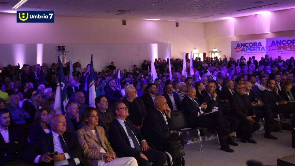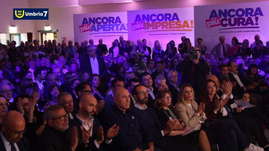 BASTIA UMBRA (Perugia) – «Tante cose abbiamo fatto in questi anni di governo, col massimo impegno. Le vogliamo raccontare agli umbri. Pensiamo di aver raggiunto risultati. Li illustreremo in questi giorni. E abbiamo un grande programma per il futuro, pieno di altro lavoro da fare. Altre sfide che vogliamo vincere con la gente di questa straordinaria terra che amiamo e per la quale vogliamo ancora lavorare. Una terra che ci onoriamo di rappresentare e per la quale abbiamo tante cose speciali da realizzare ancora, con tutta la nostra forza». Umbriafiere, Bastia, in faccia ad Assisi. Arriva la governatrice Donatella Tesei, completo pantaloni azzurro, stesso colore di quello scelto per il manifesto elettorale sul quale campeggia il claim: «Ancora più Umbria». Dice, prima di salire sul palco: «Partiamo da qui per parlare a tutta l’Umbria».