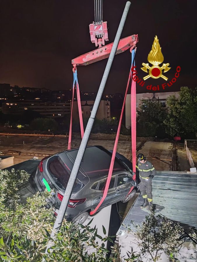 La vettura, andando fuori strada ha divelto un parapetto ed è caduta da un’altezza di circa 3 metri, finendo sopra alcuni container di un cantiere edile. Il conducente è uscito da solo dalla vettura. È stata necessaria l’autogru per la rimozione della vettura.