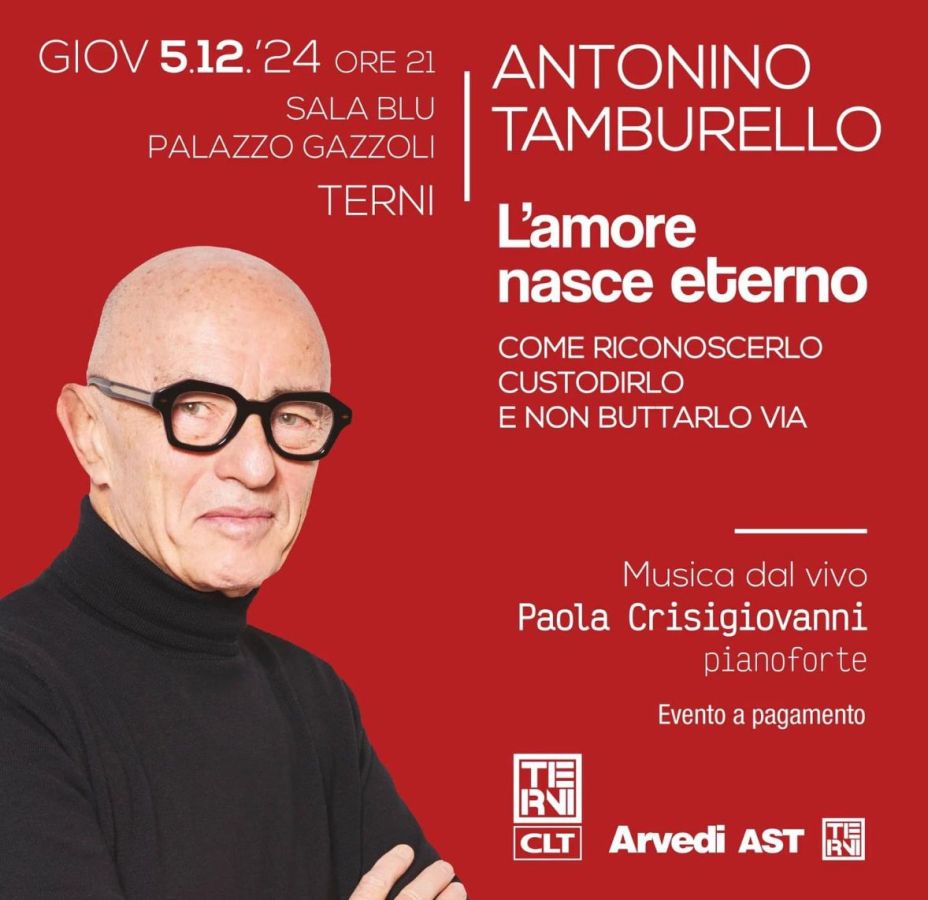 TERNI – “L’amore nasce eterno – Come riconoscerlo, custodirlo e non buttarlo via” è il titolo dell’incontro e confronto con il Prof. Antonino Tamburello per aprire un nuovo sguardo sulle relazioni sentimentali. Accompagnato dalla musica dal viv, a cura della pianista e composotrice Paola Crisigiovanni, lo psichiatra toccherà le corde dell’animo delle persone di ogni età per parlare dell’amore in tutte le sue forme il 5 dicembre alle ore 21 nella sala blu di Palazzo Gazzoli.