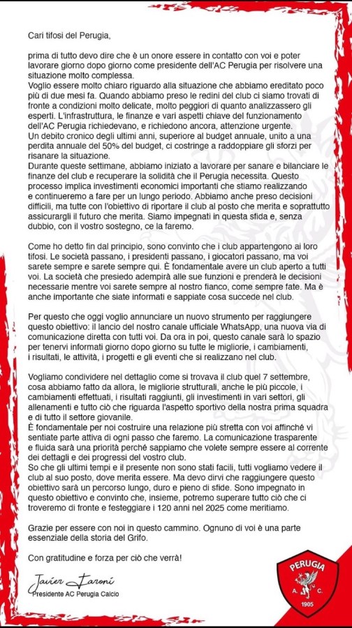 PERUGIA – Javier Faroni, presidente dell’Ac Perugia Calcio, ha scritto una lunga lettera ai tifosi, in cui mette nero su bianco le difficoltà, anche finanziarie, della società e del lavoro da fare per il Grifo.