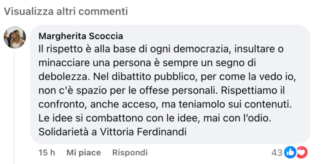 Solo pochi giorni fa Margherita Scoccia aveva replicato ad un hater anonimo sulla propria pagina Instagram che aveva commentato un suo post: «Sei sempre molto aggressivo o aggressiva, perché non vieni fuori col tuo vero nome anziché trincerarti dietro uno pseudonimo? La discussione è aperta ma serve che ci metti la faccia». In quella circostanza la Scoccia aveva parlato della diffusione dei profili fake e della questione dell’odio online come di problemi «sempre più urgenti da affrontare». Nessun commento, in quella circostanza, da parte della sindaca Vittoria Ferdinandi.