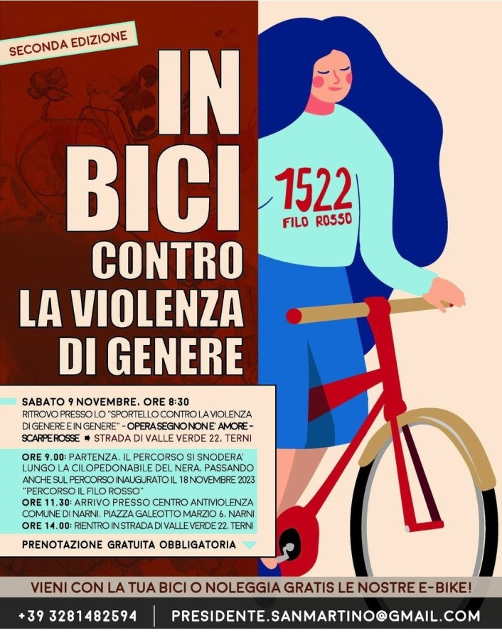 TERNI – Pedalare tutti insieme per dire “No” alla violenza di genere. L’appuntamento è fissato per il 9 novembre con partenza dallo “Sportello Contro la Violenza di Genere In Genere”. Il percorso attraversa il suggestivo “Percorso Il Filo Rosso” fino al xentro antiviolenza di Narni per concludersi con un ristoro offerto da Laboratorio Caffetteria “Altravista” presso il Centro il Faro. La prenotazione è gratuita ma obbligatoria, chiamando il numero: 3281482594 o scrivendo per email a: presidente.sanmartino@gmail.com.