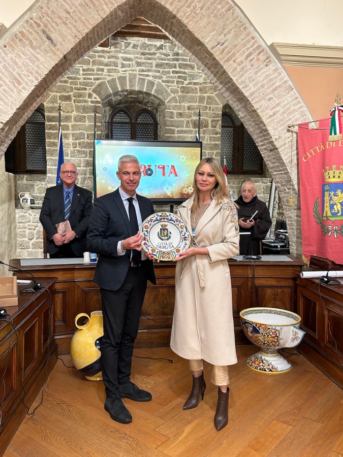 Poi è stato il momento dell’ospite d’onore Anna Falchi che ha manifestato tutta la sua emozione e felicità per vivere insieme alla comunità di Deruta questo importante e significativo momento. «Ringrazio in primis il sindaco di Deruta per questo graditissimo invito perché essendo romagnola passo spessissimo da queste parti dove mi fermo anche a mangiare le prelibatezze della vostra cucina umbra. La Città di Deruta si fa precedere dalla sua fama e tramite la ceramica porta il Made in Italy in giro per il mondo. L’incontro di oggi mi rimarrà nel cuore perché ho avuto modo di conoscere persone molto affettuose e cordiali e ho molto apprezzato la bellezza di questo Albero di Natale realizzato in Ceramica. Tra l’altro, essendo anche io un’artista, sono molto orgogliosa che la ceramica stia rivivendo una nuova linfa sebbene le contingenti difficoltà».
