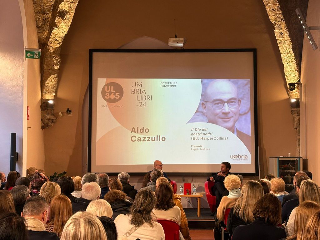 TERNI – Talmente tante persone da bloccare gli accessi alla Bct. Prosegue con enorme successo il pomeriggio di Umbria Libri. Il giornalista e conduttore televisivo Aldo Cazzullo viene accolto con un grande applauso. Protagonista sul palco del caffè letterario insieme a Angelo Mellone per presentare il suo nuovo libro “Il dio dei nostri padri”.Un volume che parla della Bibbia come un libro meraviglioso. «Dopo aver scritto libri sull’impero romano – afferma Cazzullo – sul fascismo, sulla resistenza, ho voluto scrivere un libro sulla Bibbia, da leggere come un grande romanzo che contiene rimandi all’attualità. È il testo sacro per eccellenza che contiene le radici della nostra fede e della nostra cultura».