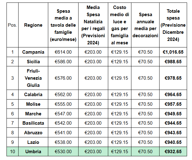 In cima alle regioni italiane che spenderanno di più durante le feste c’è la Campania con una media di 1.016 euro per famiglia. A seguire la Sicilia con una spesa di 989 euro .In terza posizione il Friuli-Venezia Giulia, con un totale di 979 euro. In quarta la Calabria con una spesa media di 965 euro, quinto il Molise con 958 euro. Le Marche al sesto posto con 950 euro, seguite dalla Basilicata con 945 euro e dall’Abruzzo con 944 euro. Nono posto per il Lazio con una spesa di 941 euro, mentre l’Umbria con 933 euro chiude la top 10.