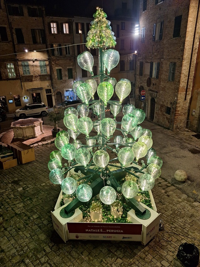 In piazza Giordano Bruno a Perugia, invece, è stato allestito uno speciale albero di Natale frutto della collaborazione fra Comune, Fondazione Perugia e Scart, il progetto artistico del Gruppo Hera. L’albero, di grande effetto scenografico e alto circa sette metri, è interamente composto da materiali di recupero, come nella filosofia ambientalista del progetto. Il fusto centrale su cui poggiano i rami è un palo dell’illuminazione pubblica dismesso, mentre sulle braccia fanno bella mostra ben 54 grosse damigiane e 300 fiaschette da vino, tutte provenienti da una fattoria di Empoli.