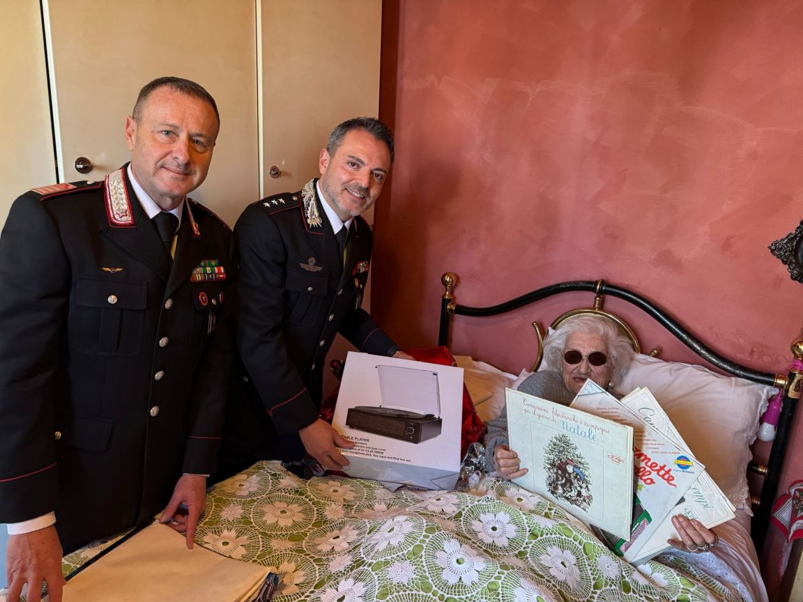 L’anziana donna, Lidia Marioli, di 92 anni, con un passato da artista nel mondo dello spettacolo a teatro e al cinema con prestigiose collaborazioni anche con il grande Totò (di cui si ricorda aneddoti inediti) ed altre icone del piccolo schermo, da sempre residente nel capoluogo altotiberino, vive da qualche anno senza nessun congiunto o parente con cui potersi ritrovare, soprattutto nel periodo natalizio che è il momento dell’anno più sentito dal punto di vista delle relazioni affettive. Nonostante l’età, la nonnina tifernate ha molto apprezzato la visita dei militari dell’Arma, rappresentata dal comandante della Compagnia, capitano Massimiliano Croce, e dal comandante di stazione, il luogotenente Fabrizio Capalti. Una volta all’interno nell’accogliente abitazione i carabinieri hanno voluto allietare il momento attraverso un particolare gesto di solidarietà, omaggiando la cara signora di un giradischi, nuovo ma in stile vintage, e tre dischi vinili contenenti canti di natale e musica della tradizione classica italiana degli anni ’50 e ’60, fra cui una memorabile edizione rivisitata di “Parlami d’amore Mariù” di Achille Togliani. Le canzoni da sempre predilette, quelle che da giovane l’hanno accompagnata nella vita e che spesso gli sono ritornate in mente. La dolce melodia ha reso subito l’ambiente coinvolgente ed emozionante, regalando all’anziana donna un momento di commozione e felicità, che soltanto la musica sa fare attraverso sonorità rievocatrici di bei tempi passati.